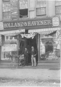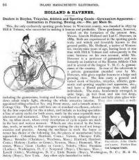 This, the only exclusively sporting goods house in Worcester county, was founded in 1877 by Hill & Tolman, who succeeded in making it famous and profitable. Those gentlemen, however, retired on the formation of the present firm, Messrs. Lincoln Holland and Lud C. Havener, in 1889. Both are experienced in the sporting goods trade and widely and favorably known to the general public, Mr. Holland, a native of Worcester, twenty-nine years of age, having been at one time with Hill & Tolman and subsequently in the same business on his own account, while Mr. Havener is a professor of gymnastics and was formerly an instructor of the Boston Athletic Club and in several of the largest Y. M. C. A. gymnasiums of the country. In rear of the salesroom is a private gymnasium presided over by Mr. Havener, who gives regular lessons to a large and growing class. The firm carry a general and varied stock of bicycles, tricycles, athletic, gymnastic and sporting supplies and apparatus, etc., and have a liberal patronage from clubs and individuals. The store, handsomely arranged, is quite large, 35 feet front and 100 feet deep, including the gymnasium, boxing and fencing school in rear. Broad and lofty plate glass windows admit ample light, showing the whole attractive interior. They also conduct a well-appointed riding-school at No. 215 Front street, and a branch store at Cottage City. The goods sold here are of standard excellence, selected by the firm especially for this market, and include as leading specialties a line of safety cycles for both sexes, made by the most reputable manufacturers and warranted. They have a completely equipped shop at No. 19 Allen street, where every description of cycle repairs are made in the best and neatest manner. Wheels are also rented by the hour, day, week, or month, so that strangers visiting the city need not forego exercise and practice. Among the machines in stock the buyer or renter has choice of the following list, the places of manufacture being appended: Columbias, Hartford, Conn.; Victors, Chicopee Falls, Mass.; Broncho (Chainless), Westboro, Mass.; Hartford, Hartford, Conn.; Hickory (Ladies or Gents), Newton, Mass.; Diamond, Worcester, Mass.; Giant (Ladies or Gents), Toledo, Ohio; Premium (Ladies), Washington, I). C.; Nonpareil (Boys), Chicopee, Mass.; Lovell (Girls), Washington, D. C.; Little Beauty (Boys), Washington, D. C.; H.& H. Safety (Boys), New York. Any other style furnished to order.